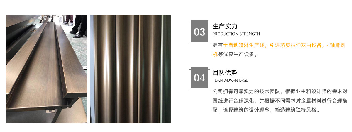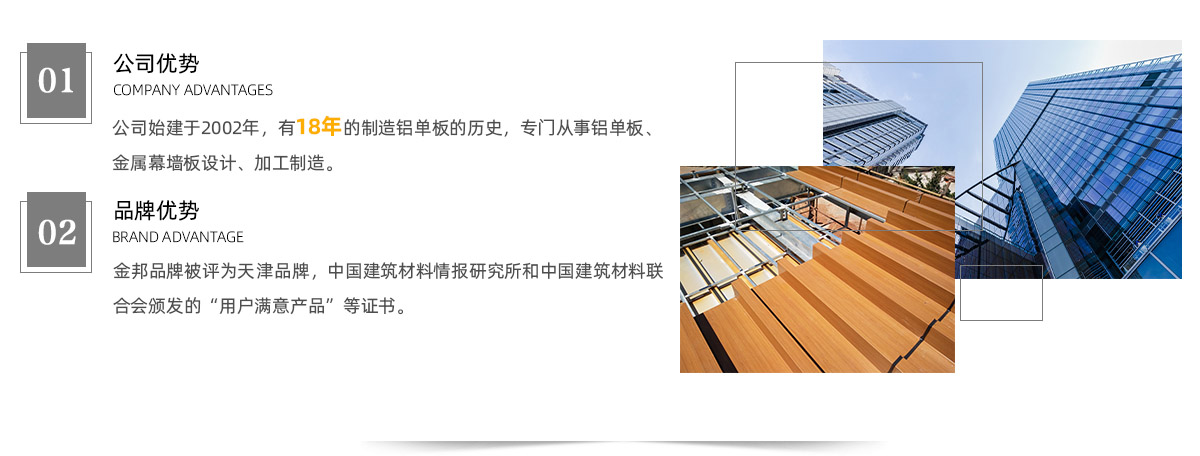 天津金邦建材有限公司始建于2002年,有18年的制造鋁單板的歷史,天津金邦晟泰建材有限公司傳承于天津金邦建材有限公司,從事鋁單板、金屬幕墻板設(shè)計、加工制造,公司堅持走自我創(chuàng)新之路,近年來碩果累累,實現(xiàn)了公司的飛速發(fā)展。2017年為適應(yīng)新市場,配合產(chǎn)業(yè)升級改造,天津金邦建材有限公司全資投建天津金邦晟泰建材有限公司,公司注冊地為天津靜海區(qū)中旺產(chǎn)業(yè)園內(nèi),占地60余畝,新建全華北地區(qū)全自動噴淋生產(chǎn)線,引進蒙皮拉伸雙曲設(shè)備,4軸雕刻機等先進生產(chǎn)設(shè)備。同時公司在原有鋁單板產(chǎn)品基礎(chǔ)上進行產(chǎn)品創(chuàng)新,新增加多維板、蜂窩板連續(xù)自動生產(chǎn)線,從而更加豐富的產(chǎn)品系列,為業(yè)主提供更多更好的幕墻材料解決方案。公司擁有實力技術(shù)團隊,根據(jù)業(yè)主和設(shè)計師的需求對圖紙進行合理深化,并根據(jù)不同需求對金屬材料進行合理搭配,詮釋建筑的設(shè)計理念,締造建筑風(fēng)格。